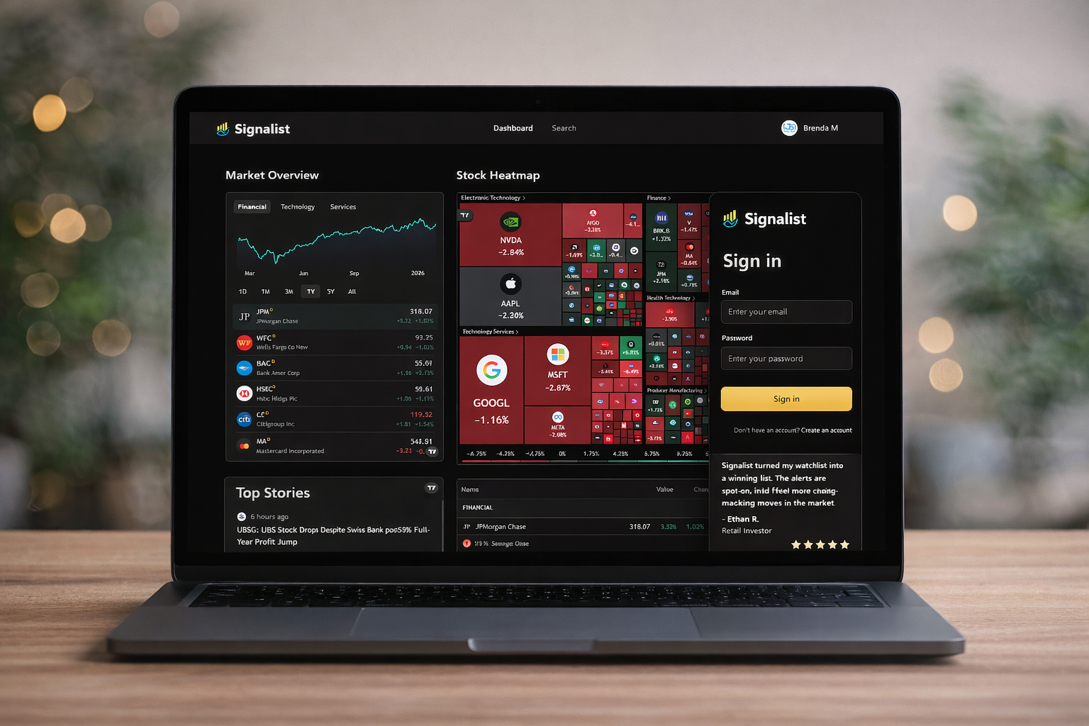 This project is a Next.js stock‑tracking app with email/password auth and a personalized onboarding flow. It embeds TradingView market widgets on the home page, pulls stock search and news via Finnhub, and stores user watchlists in MongoDB. It also uses Inngest to send AI‑generated welcome emails and daily news summaries based on each user’s watchlist.